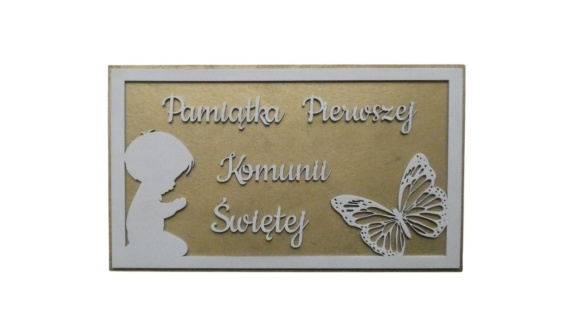 Tabliczka z napisem "  Pamiątka Pierwszej Komuni Świętej " o wymiarach 39x23cm