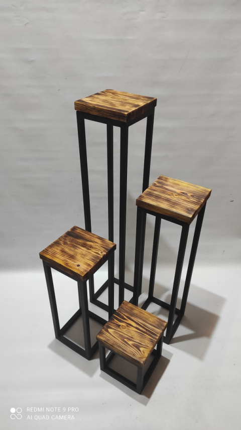 Produkty które wykonujemy są w całości " handmade ". W tym ogłoszeniu przedstawiamy państwu komplet kwietników w stylu loft. Różne rozmiary i wysokości kwietnika, sprawia ze wasze ulubione kwiaty oraz inne dekoracje będą się doskonale prezentowały , niezależnie od miejsca jego położenia. Konstrukcja wykonana jest z profili stalowego 20x20mm zabezpieczona lakierem proszkowym, natomiast blat o grubość 3 cm wykonany jest z naturalnego drewna.