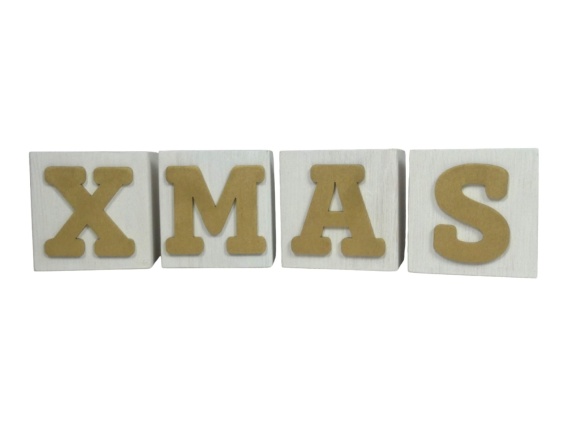 Cztery kostki z napisem "XMAS" o wymiarze 9,5x9,5x9,5cm każda.